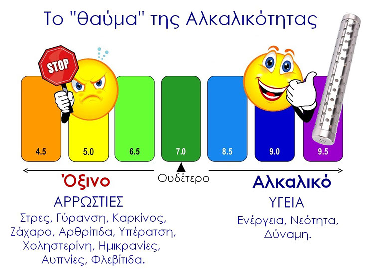 Γιατί Είναι Σημαντικό Να Πίνουμε Αλκαλικό Νερό; Ο σύγχρονος τρόπος ζωής και διατροφής βομβαρδίζει το σώμα μας με όξινες τροφές (παρακάτω ο πίνακας) και το μετατρέπει σε αποθήκη όξινων καταλοίπων. Το απλούστερο που μπορούν οι άνθρωποι να κάνουν για να βελτιώσουν την υγεία τους, να αυξήσουν την άμυνά τους και να βελτιώσουν τα επίπεδα ενέργειας του σώματός τους, είναι να καταναλώνουν Αλκαλικό, Ιονισμένο, Καθαρό Νερό! Πίνοντας αλκαλικό νερό καθυστερούμε και ανατρέπουμε την διαδικασία γήρανσης.